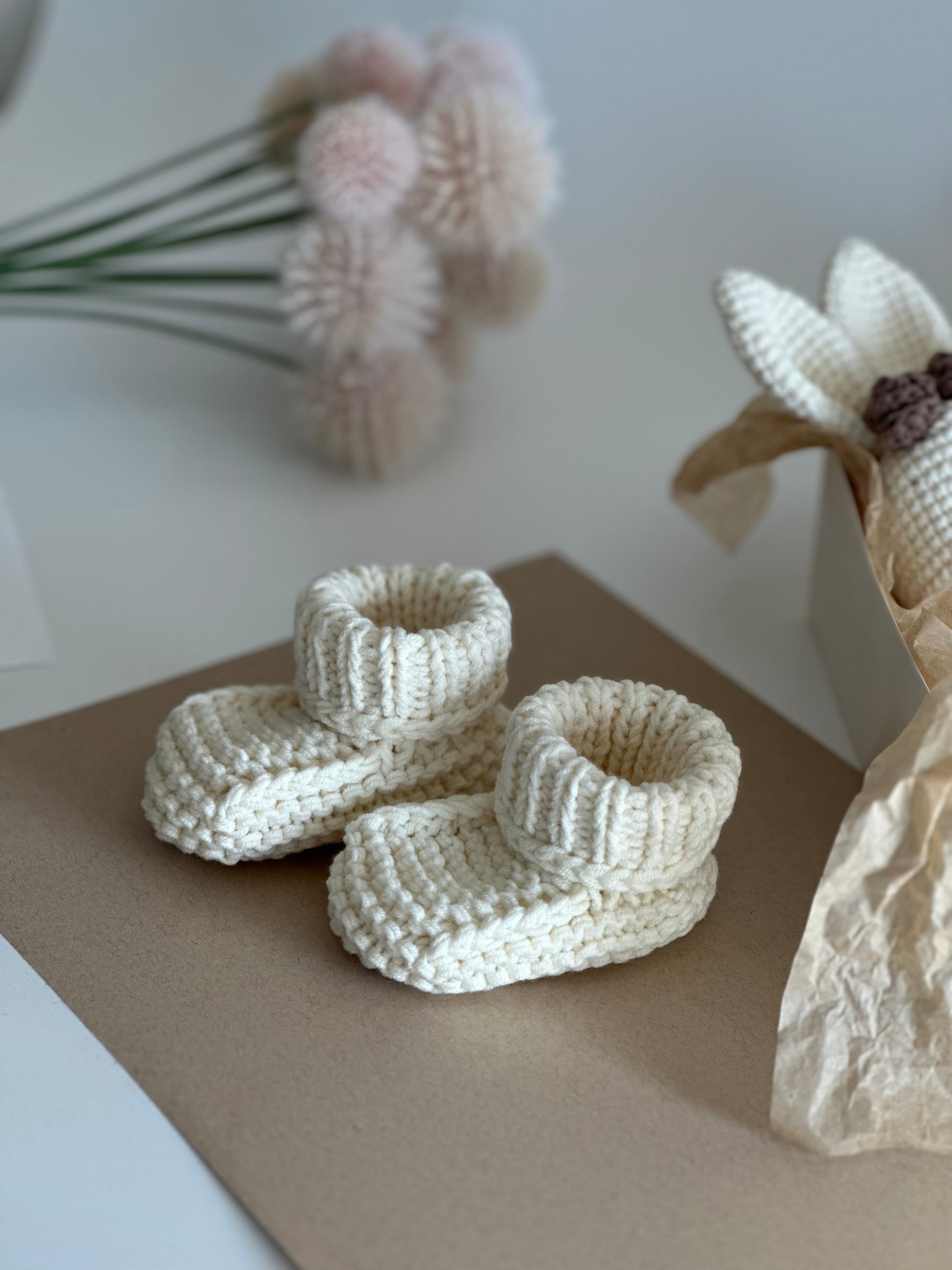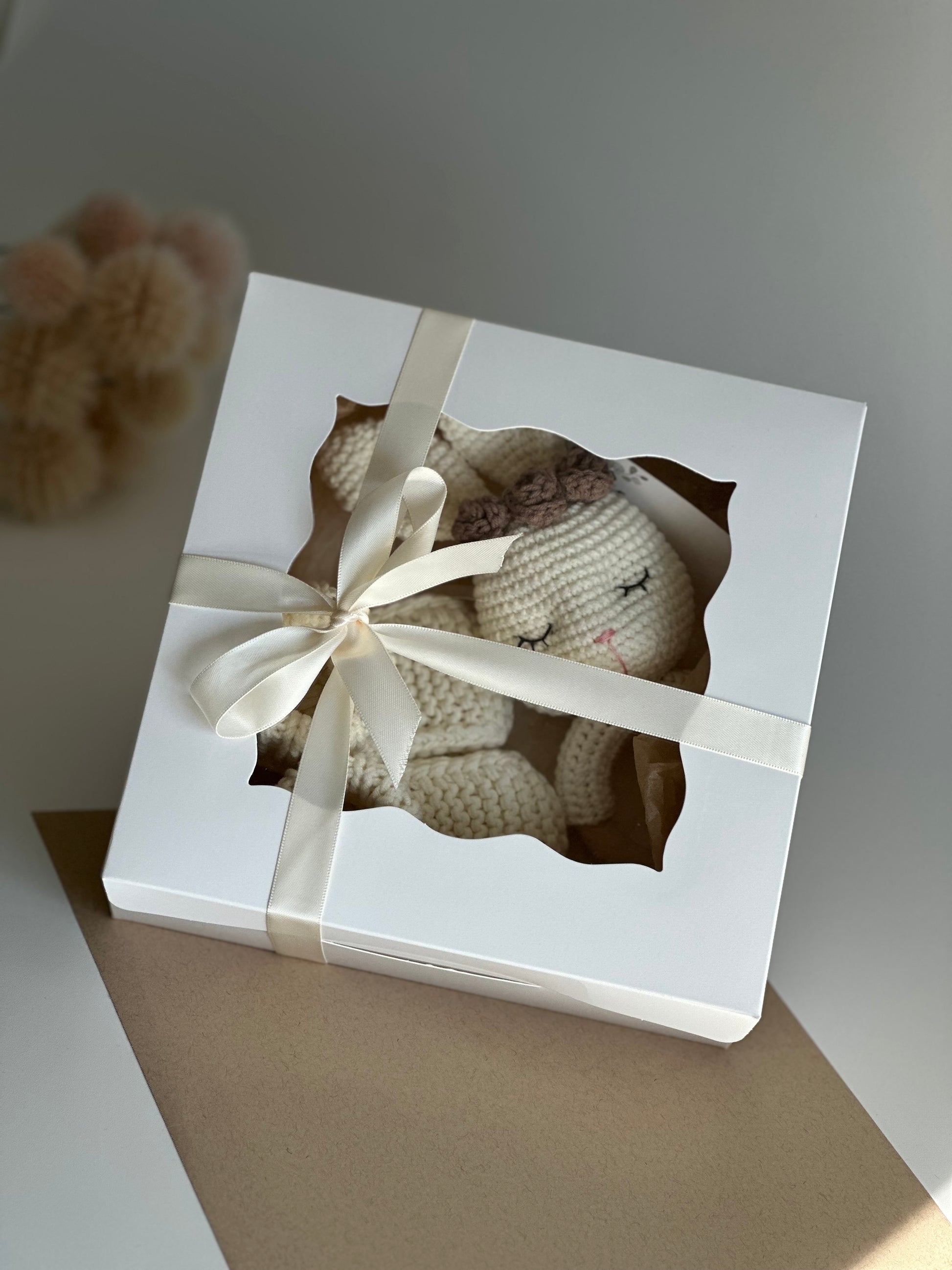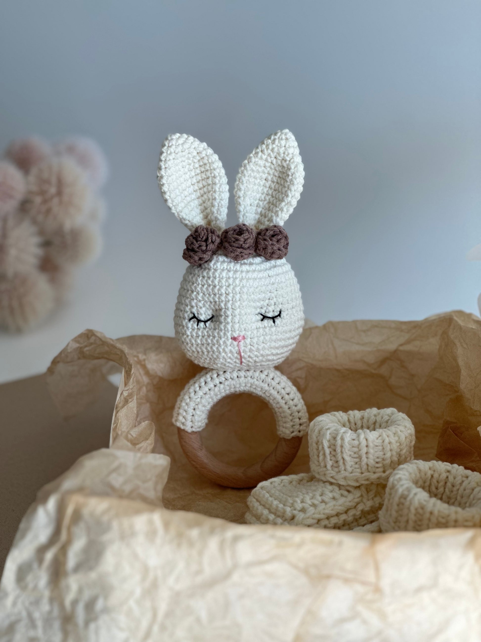Celebrate the arrival of a new baby with the Baby Gift Box. This gift set is thoughtfully curated to bring warmth, comfort and joy. This set features beautifully crocheted 100% cotton baby socks and a Bunny Rattle.