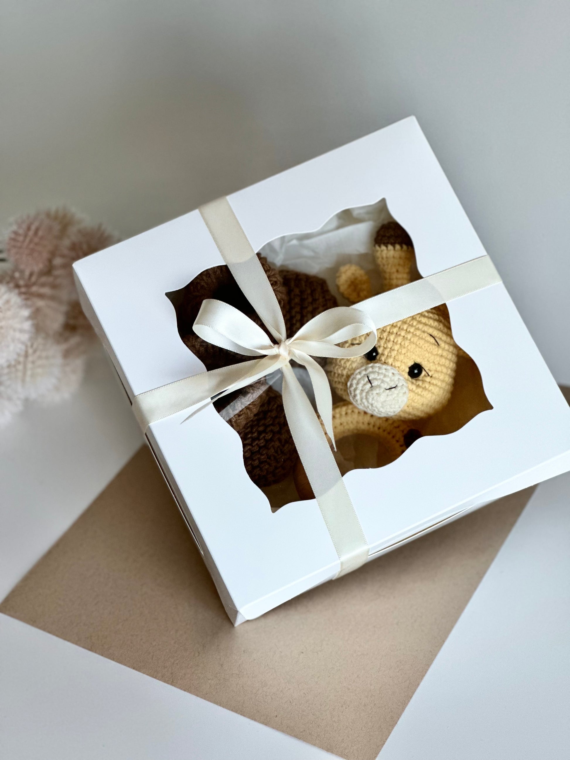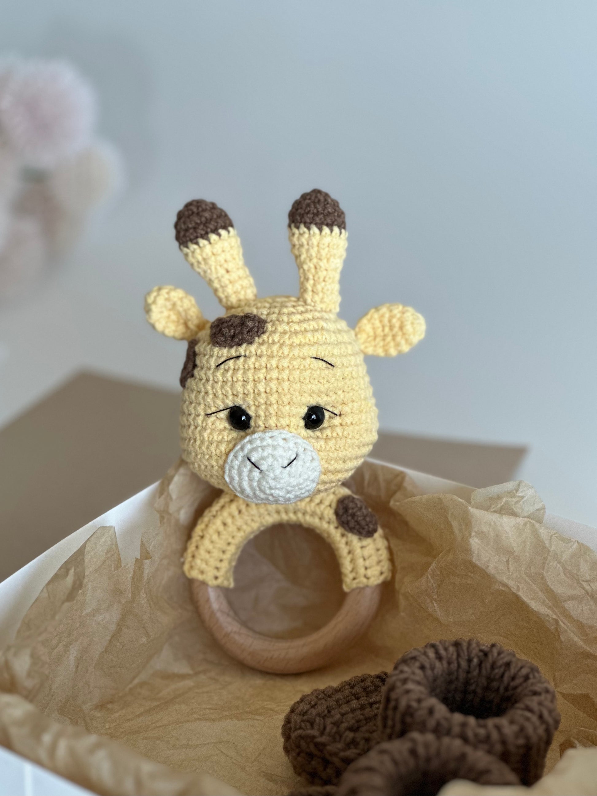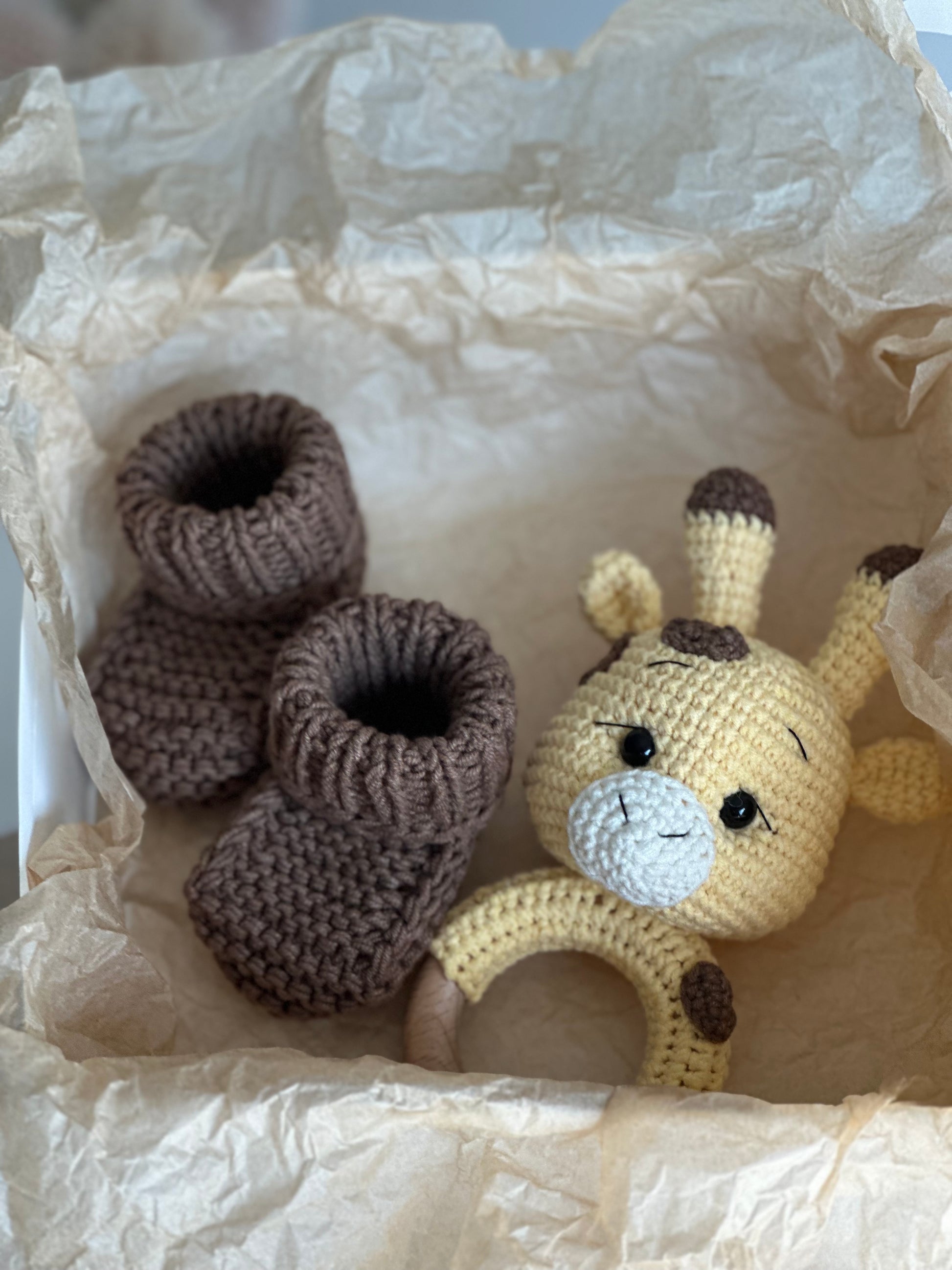 Celebrate the arrival of a new baby with the Baby Gift Box! Thoughtfully created to bring warmth, comfort, and joy, this set features beautifully crocheted 100% cotton baby socks and a Giraffe Rattle