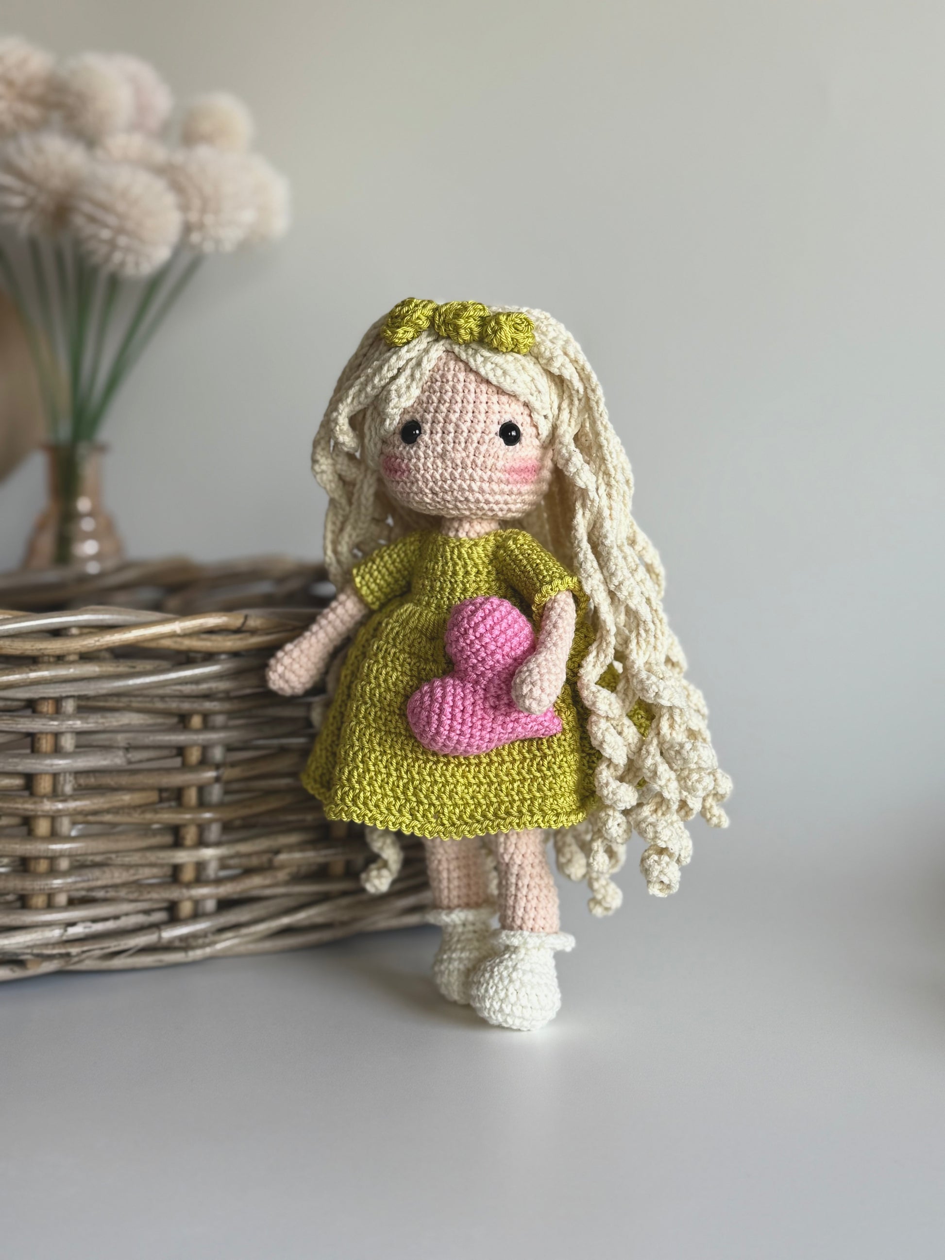 This adorable handmade crochet doll is a symbol of love, kindness, and care. Dressed in a sweet little dress and holding a soft heart in her hands, she makes a heartfelt gift for any occasion — or a charming keepsake to brighten your own space.